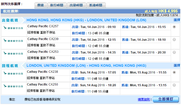 經我們測試,以倫敦6月14日出發,8月14日返回為例