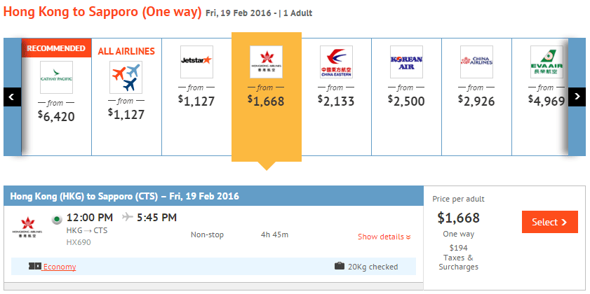 經我們測試,以札幌2月19日出發為例