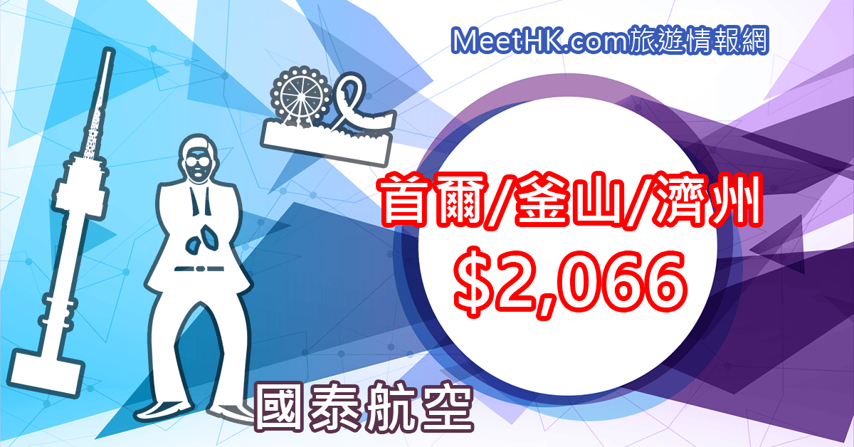 香港往返首爾、釜山、濟州二人同行每人只需$2,066,連稅首爾$2,466,釜山/濟州$2,434