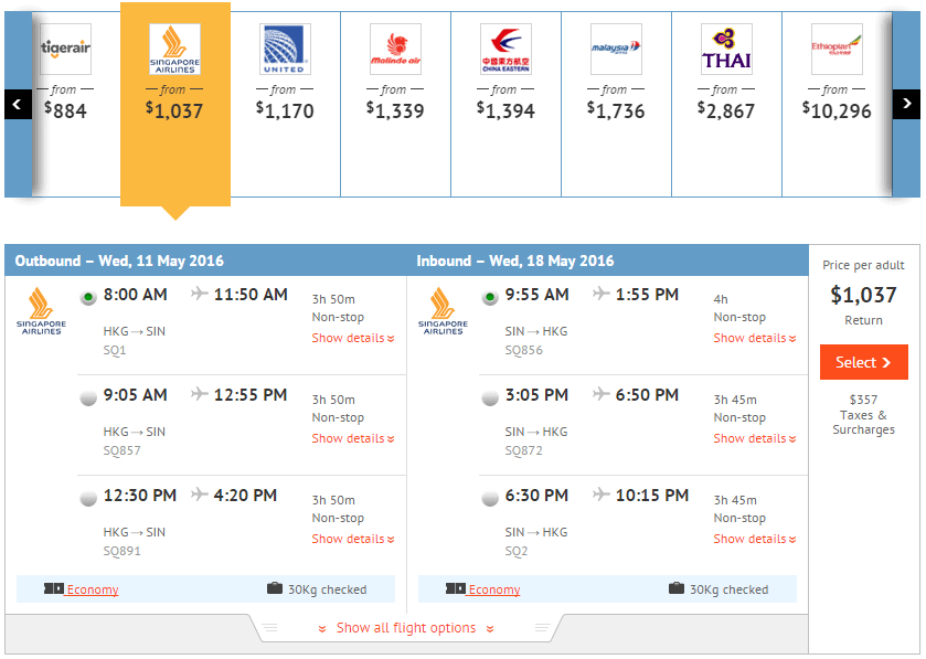 香港往返新加坡只需$937,連稅$1,294,價錢唔錯