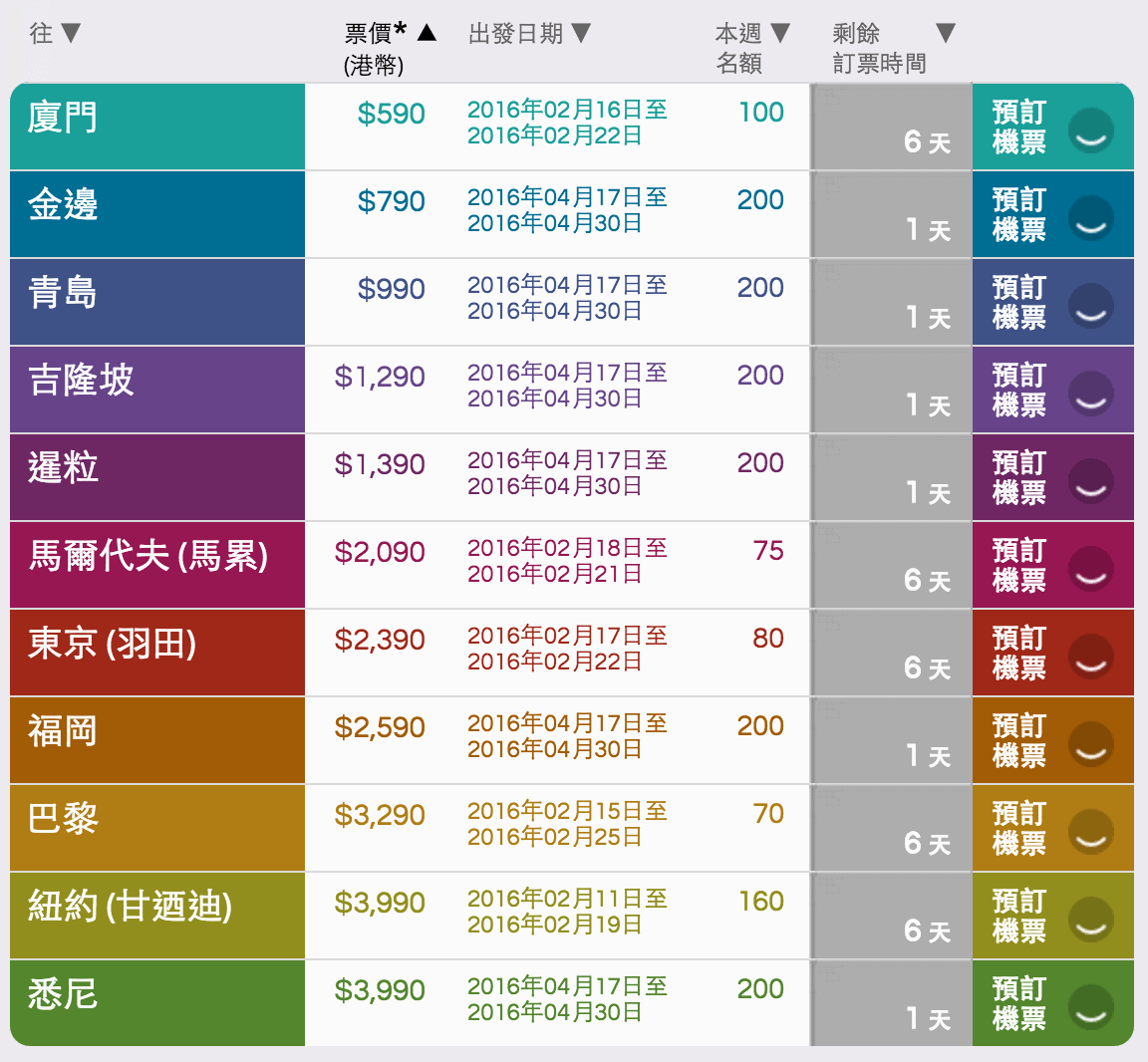 (廈門$590 連稅$817)、(金邊$790 連稅$1,105)、(青島$990 連稅$1,217)、(吉隆坡$1,290 連稅$1,540)、(暹粒$1,390 連稅$1,705)、(馬爾代夫$2,090 連稅$2,405)、(東京$2,390 連稅$2,682)、(福岡$2,590 連稅$2,773)、(巴黎$3,290 連稅$3,871)、(紐約$3,990 連稅$4,596)、(悉尼$3,990 連稅$4,741)