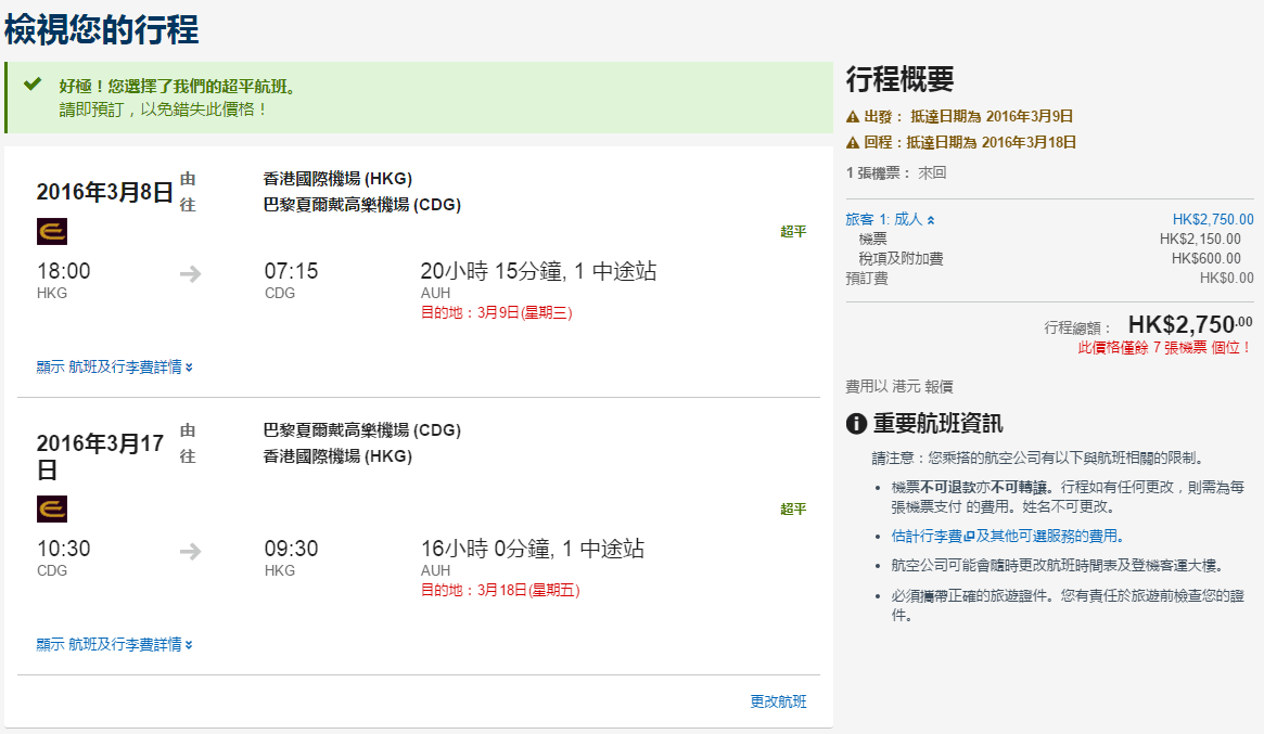 阿提哈德航空(Etihad Airways)之前推出左農曆年限時優惠,經Expedia訂竟然比官網平多成千六