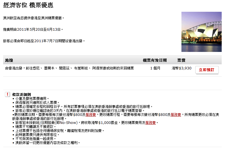 澳洲航空推出了香港至澳洲(悉尼、墨爾本、開恩茲、布里斯班、阿得萊德或珀斯)的機票優惠。