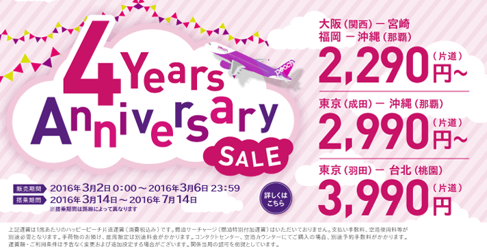 大阪單程4,990円,連稅6,860円(約$462) 旅行日期由4月4日至4月28日、5月3日至7月14日