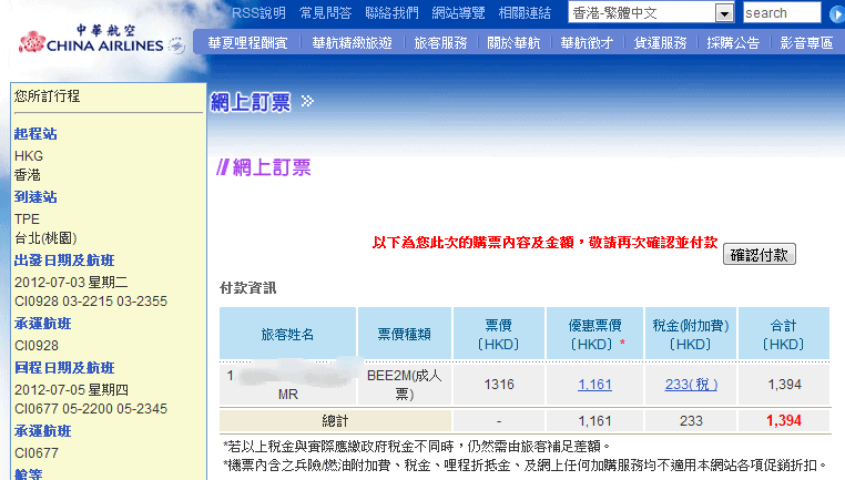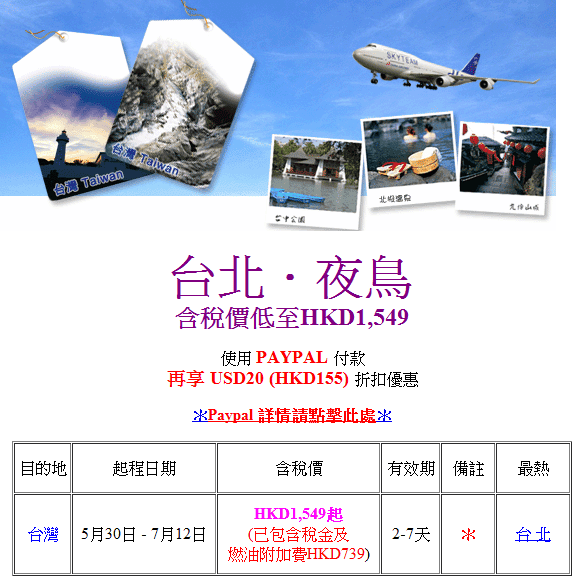 香港往返台北只需$810, 配合 PayPal 網路購票優惠減 $155,即係機票只需 $655,連埋稅 $1,394