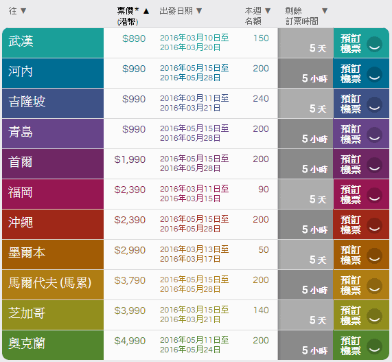 (武漢$890 連稅$1,117)、(青島$990 連稅$1,217)、(吉隆坡$990 連稅$1,240)、(河內$990 連稅$1,317)、(首爾$1,990 連稅$2,288)、(福岡$2,390 連稅$2,577)、(沖繩$2,390 連稅$2,579)、(墨爾本$2,990 連稅$3,660)、(馬爾代夫$3,790 連稅$4,105)、(芝加哥$3,990 連稅$4,596)、(奧克蘭$4,990 連稅$5,480)