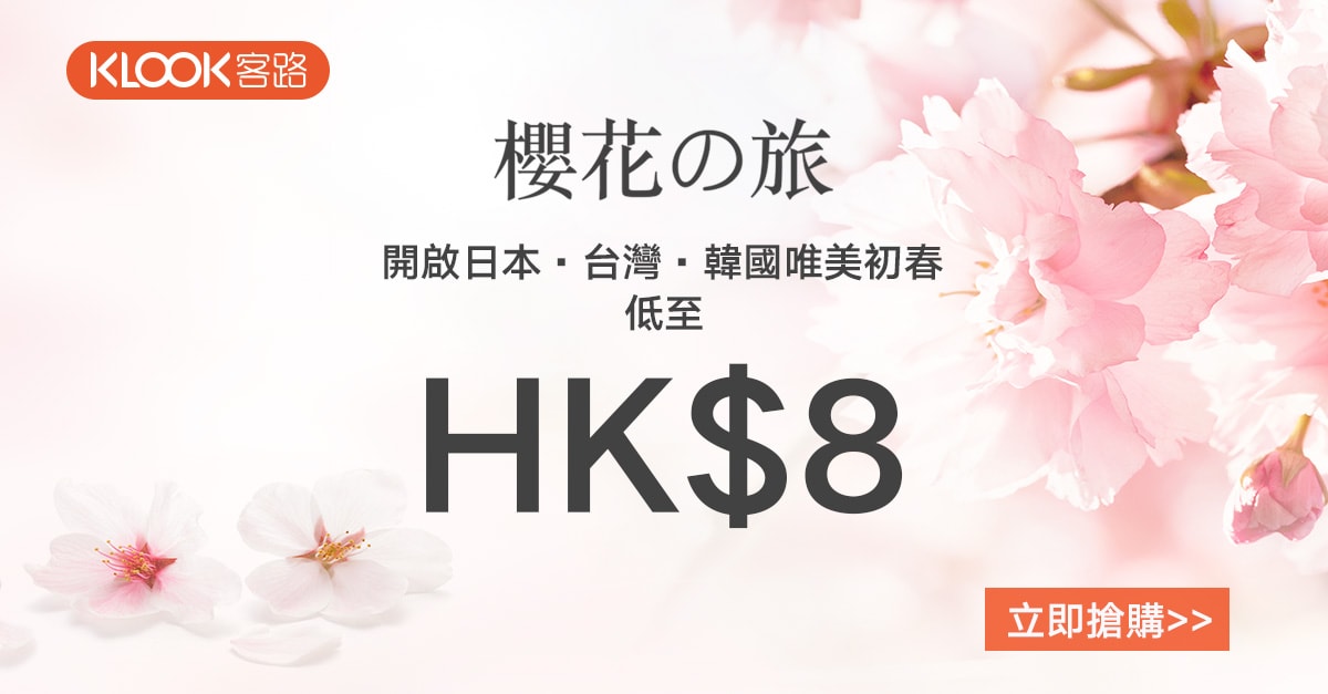 詳情:http://www.klook.com/zh-TW/hksakura2016 (滿$1,500折上再減$150優惠碼:SAKURA2016 ,適用於5月1日前購買,並於12月31日前使用 )