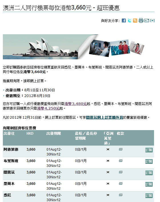 出發日期由8月1日至11月30日,優惠期同澳航同維珍一様去到6月19日
