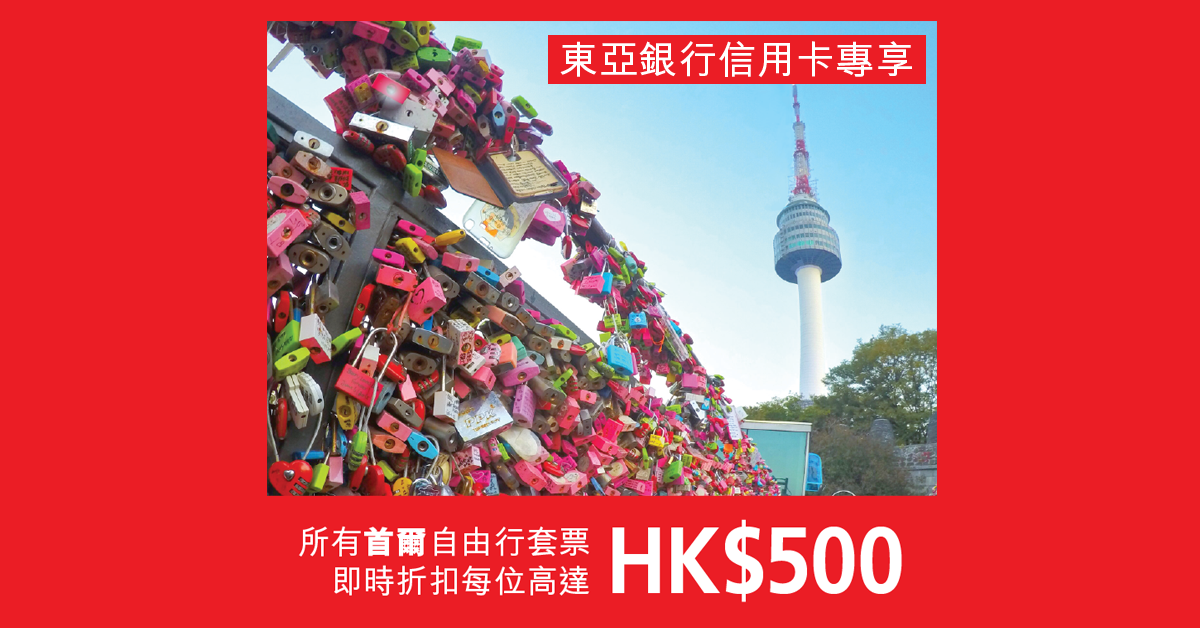 專業旅運同東亞銀行信用卡岩岩推出左全線首爾自由行套票每人減$500優惠,名額100個