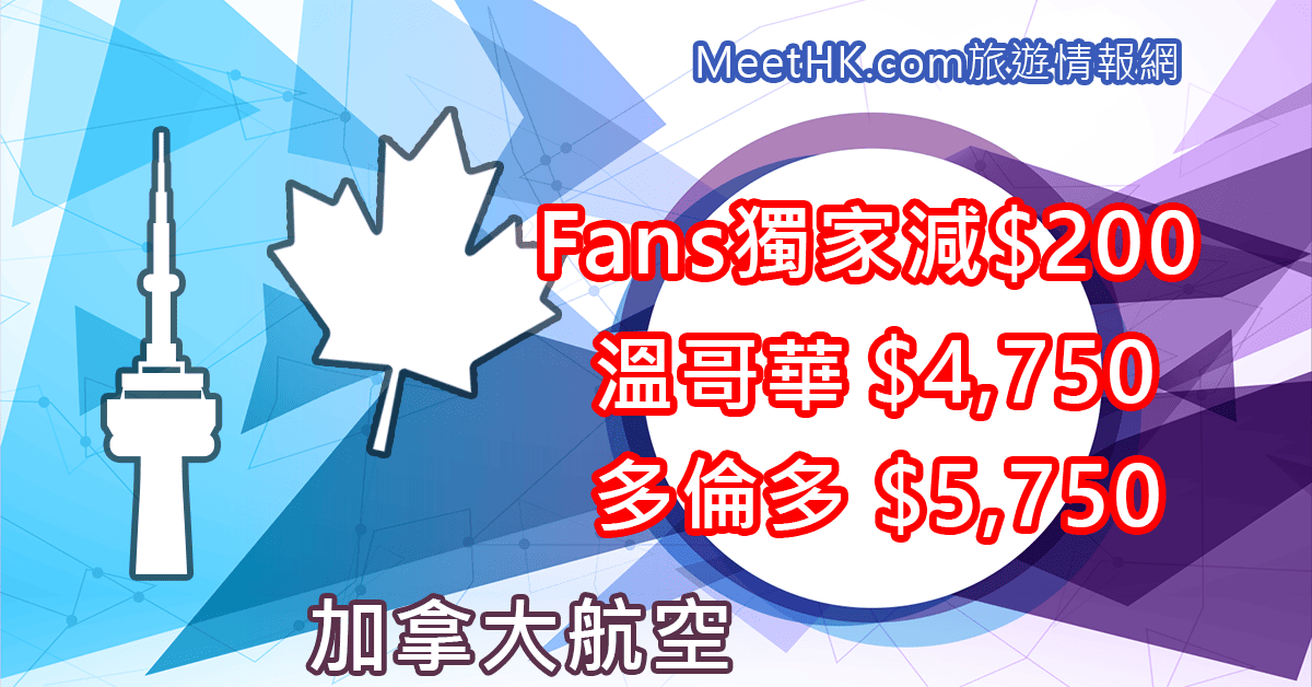 獨家減$200!12月16日前出發!香港直航往返溫哥華只需$4,750,多倫多$5,750 – 加拿大航空 (優惠至4月14日)