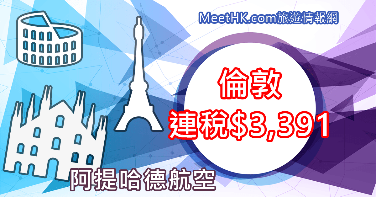 勁抵!6月7日前出發!香港往返倫敦連稅只需$3,391 – 阿提哈德航空 (優惠至4月6日)