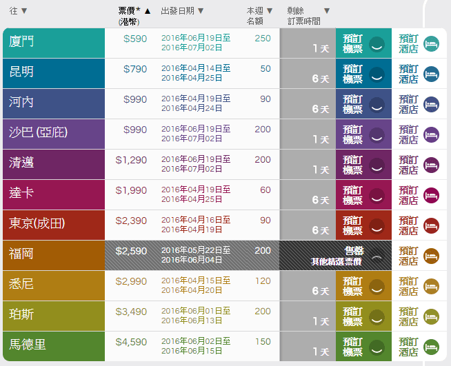 (廈門$590 連稅$818)、(昆明$790 連稅$1,018)、(沙巴$990 連稅$1,247)、(河內$990 連稅$1,316)、(清邁$1,290 連稅$1,581)、(達卡$1,990 連稅$2,676)、(東京$2,390 連稅$2,696)、(福岡$2,590 連稅$2,780)、(悉尼$2,990 連稅$3,783)、(珀斯$3,490 連稅$4,158)、(馬德里$4,590 連稅$5,235)
