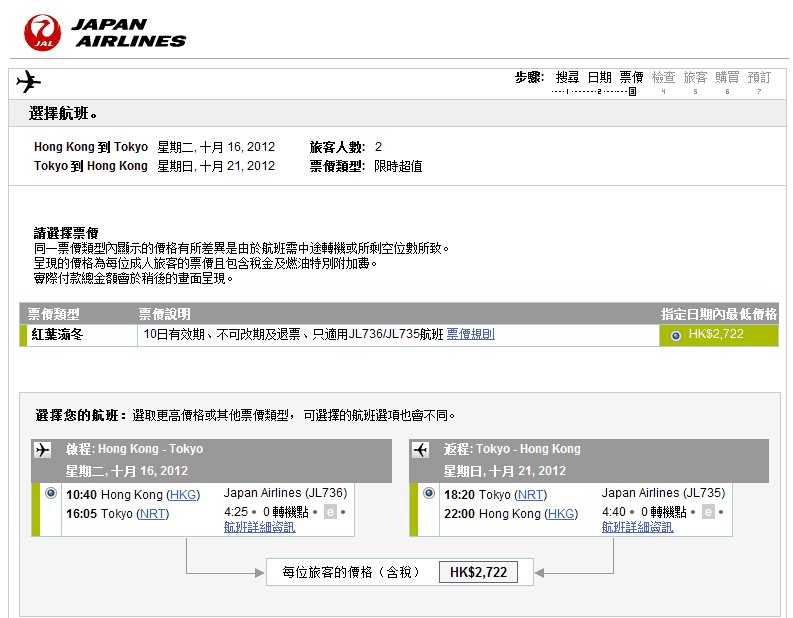 去程限坐:JL736 10:40-16:05 回程限坐:JL735 18:20-22:00 ,航班時間都ok