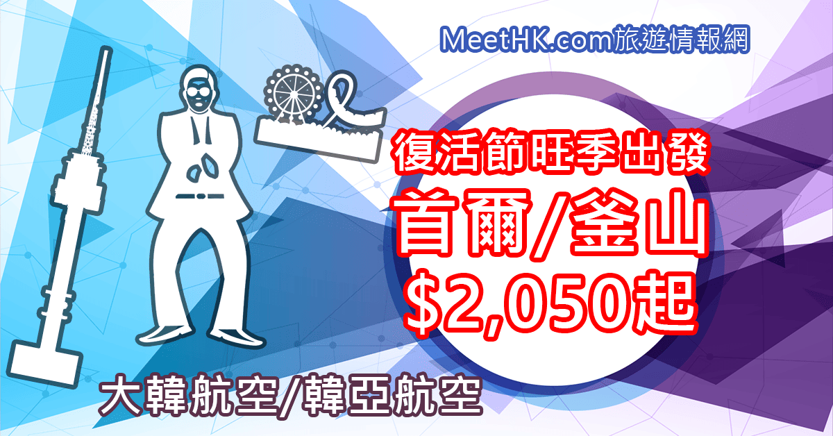 香港往返首爾、釜山只需$2,050起,連稅釜山$2,328、首爾$2,362(大韓航空);首爾$2,662(韓亞航空)