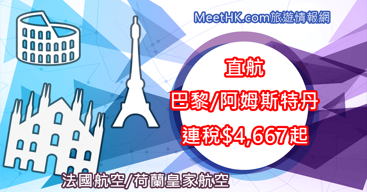 聖誕都有平!1月17日前出發!香港直航往返巴黎、阿姆斯特丹連稅只需$4,667起 – 法國航空/荷蘭皇家航空 (優惠至5月7日)
