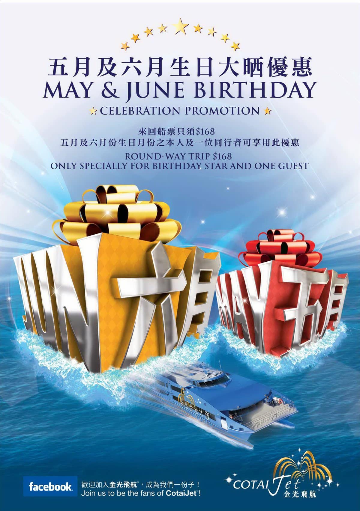 五月及六月生日大晒優惠 香港至澳門來回船票只需$168 (6月1日至6月30日) – 金光飛航