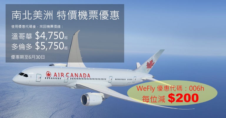 加拿大航空機票每張減$200優惠編碼:006h (適用於6月2日前使用)