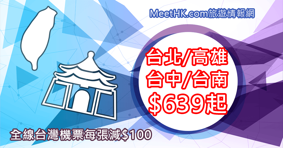 抵呀!全線台灣機票每張減$100!香港往返台北、高雄、台中、台南只需$639起 – Wefly.com.hk (優惠至6月12日)