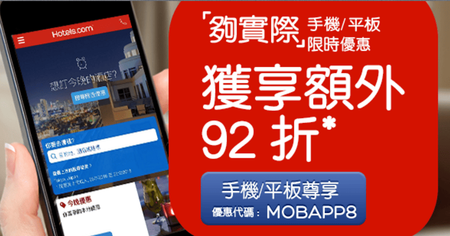 Hotels.com香港站今期推出左個8%優惠代碼,適用於Hotels.com手機網站