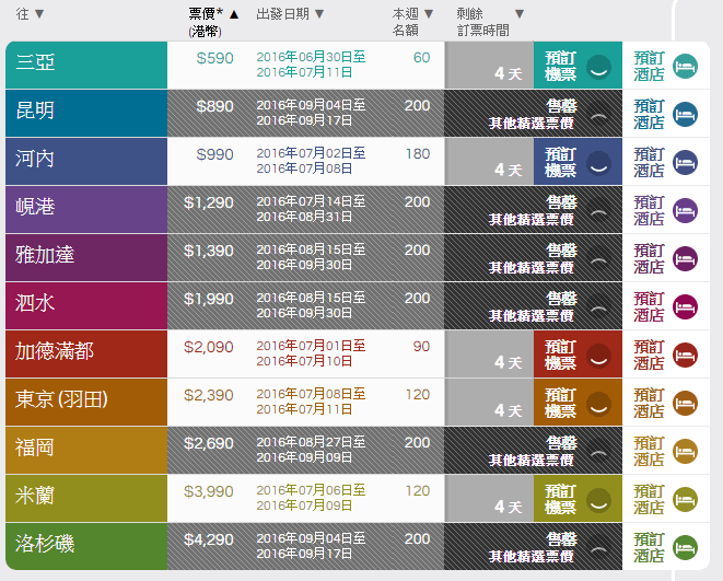 (三亞$590 連稅$816)、(昆明$890 連稅$1,116)、(河內$990 連稅$1,316)、(峴港$1,290 連稅$1,547)、(雅加達$1,390 連稅$1,598)、(泗水$1,990 連稅$2,227)、(加德滿都$2,090 連稅$2,447)、(東京$2,390 連稅$2,709)、(福岡$2,690 連稅$2,882)、(米蘭$3,990 連稅$4,381)、(洛杉磯$4,290 連稅$4,894)