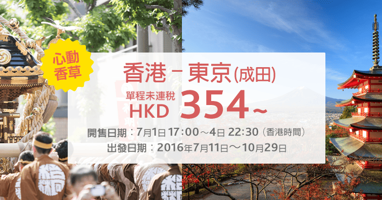 香港飛東京成田單程只需$354,來回連稅$983,連稅唔駛一千