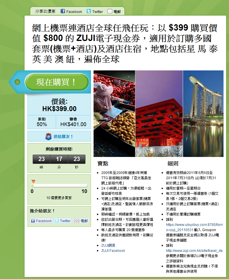 以$399購買價值$800的ZUJI電子現金券,適用於訂購多國套票(机票+酒店)及酒店住宿 – GROUPON (至6月1日11:59pm)
