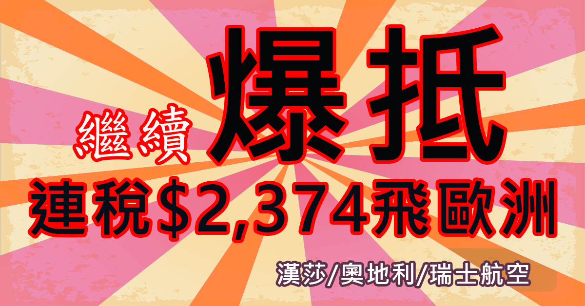 又有啦!爆抵!連稅二千三飛歐洲!明年6月24日前出發!香港來回歐洲各地連稅只需$2,374起 – 德國漢莎航空/奧地利航空/瑞士航空 (優惠至7月15日)