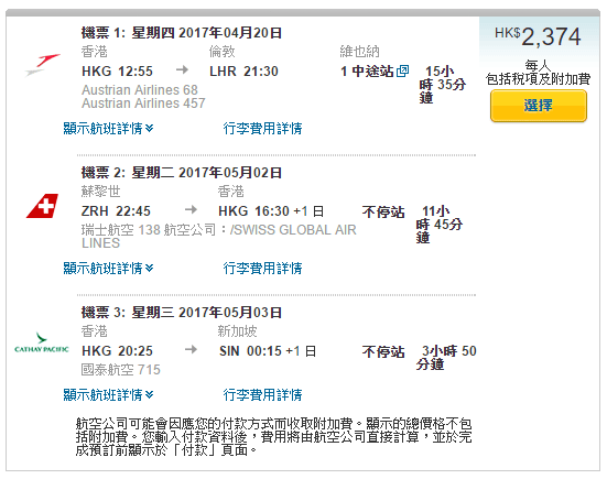 以4月20日香港飛倫敦,5月2日蘇黎世飛香港,5月3日香港飛新加坡,來回連稅$2,374
