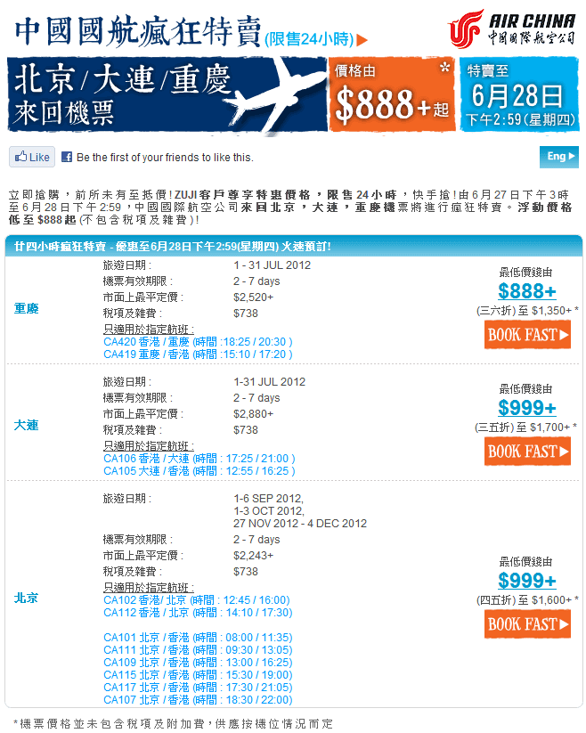今朝特然收到 ZUJI Hong Kong 方面通知,佢地會係而家到聽日(6月28日14:59)同國航方面黎個只限24小時既機票優惠