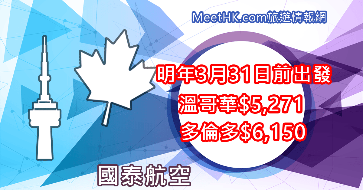 香港直航往返溫哥華只需$5,271,連稅$5,723;多倫多$6,150,連稅$6,646