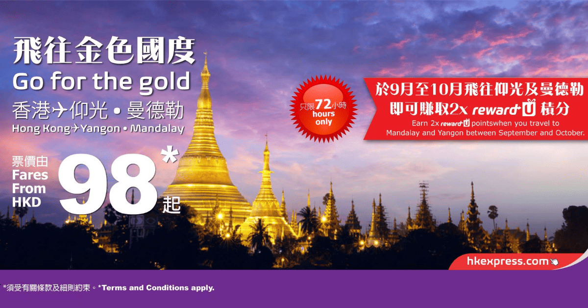 平飛神秘金色國度!今晚12點開賣!香港飛曼德勒、仰光單程只需$98 – HK Express (優惠至7月17日)