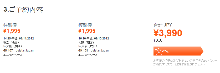 經我們測試,以東京往返大阪9月11日出發,9月13日返回為例
