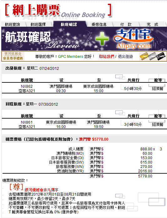 機票 MOP888+ 稅MOP1,038 機票連稅 MOP1,926