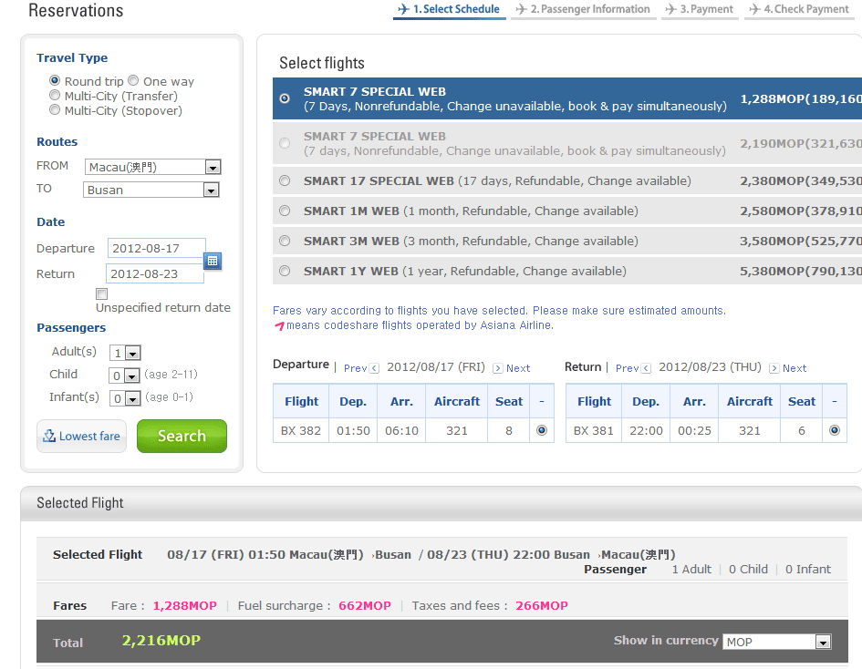 佢地推出左個開航優惠,澳門往返韓國釜山只需MOP1,288起,連埋稅MOP2,216