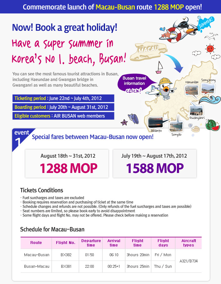開航優惠 暑假旺季出發 澳門往返韓國釜山只需MOP1,288 – 釜山航空 Air Busan (優惠至7月4日)