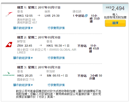 以5月17日香港飛倫敦,5月30日蘇黎世飛香港,5月31日香港飛新加坡,來回連稅$2,374