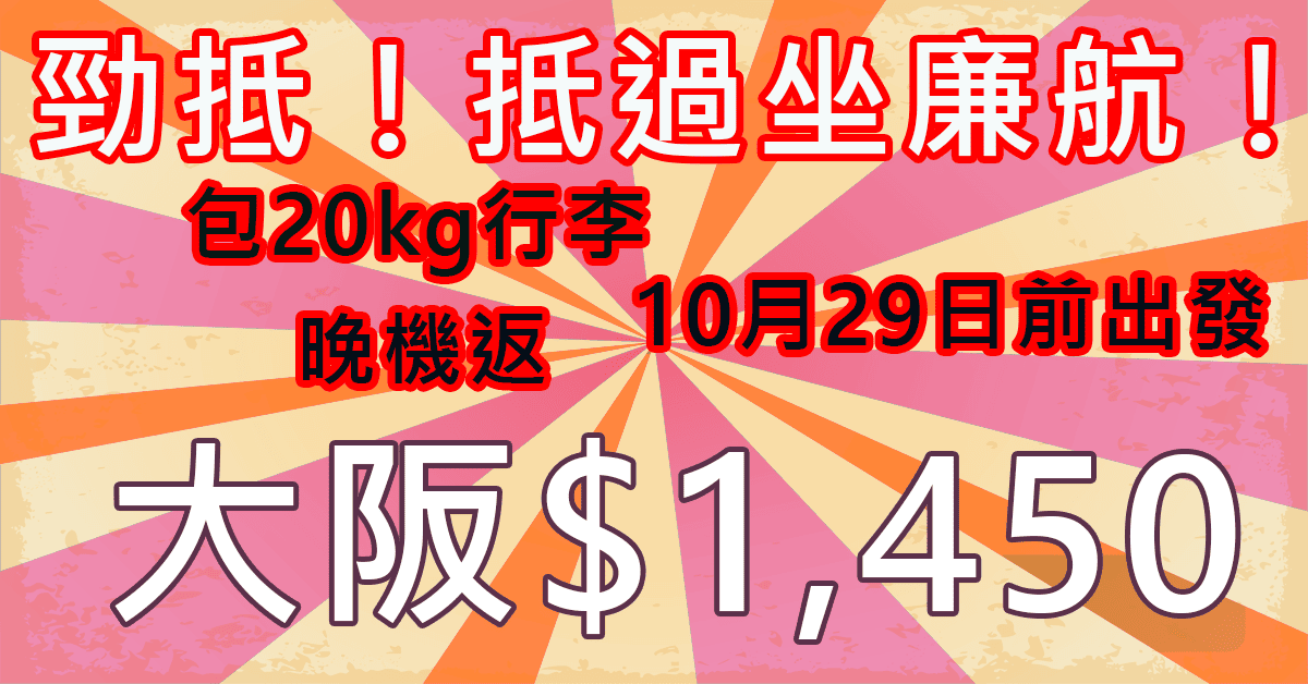 香港往返大阪只需$1,450,連稅$1,892,呢個價以後仲使咩等廉航promotion