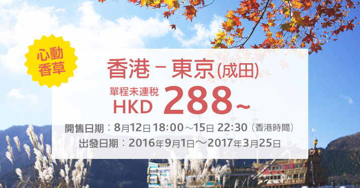 香港飛東京成田單程只需$288起,來回連稅$944起,價錢好吸引