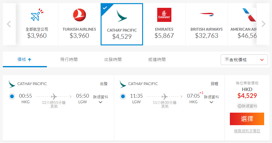 香港直航往返倫敦格域(Gatwick)只需$4,529,連稅$5,728