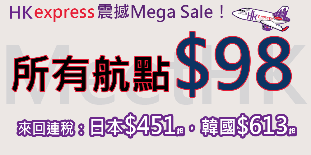 嘩!必搶!全線$98 Mega Sale!所有航點單程只需$98 – HK Express (優惠至8月21日)