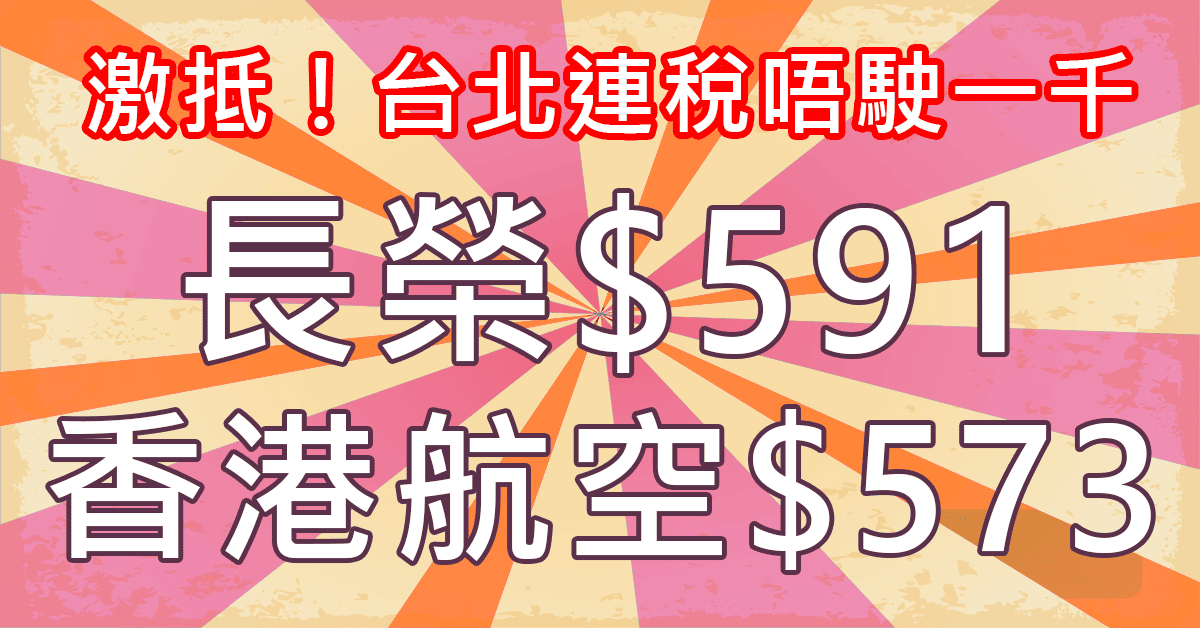 激抵!連稅唔駛一千飛台北!長榮17年6月前出發,台北只需$591!港航10月29日前出發,台北$573!– Wefly.com.hk (優惠至8月23日)