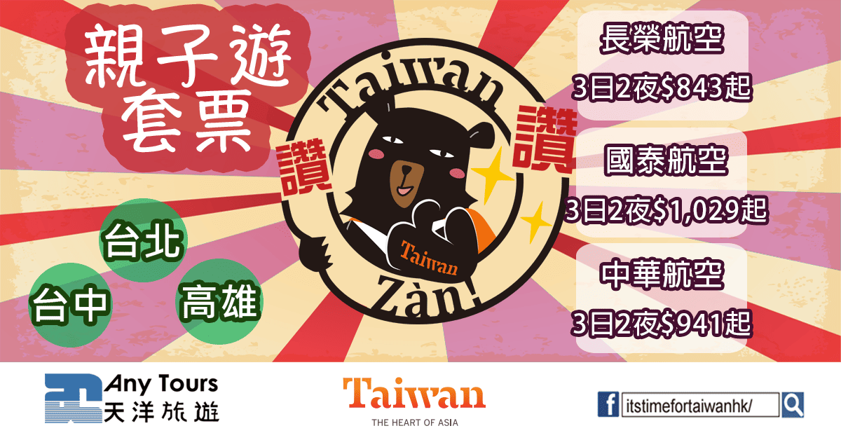 台灣親子遊套票!台灣套票(機票連2晚酒店)每人$768起,長榮$843起、華航$941起、國泰$1,029起 – Any Tours 天洋旅遊