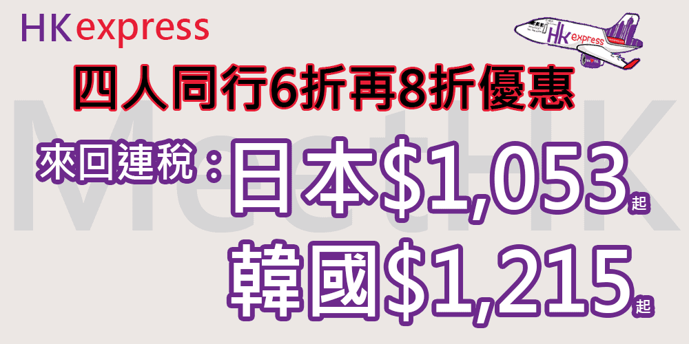 越多人訂越抵!四人同行6折再8折!今晚12點開賣!香港飛台中/花蓮/東南亞單程$187起,首爾/釜山/濟州$359,日本各地$359起 – HK Express (優惠至9月8日)