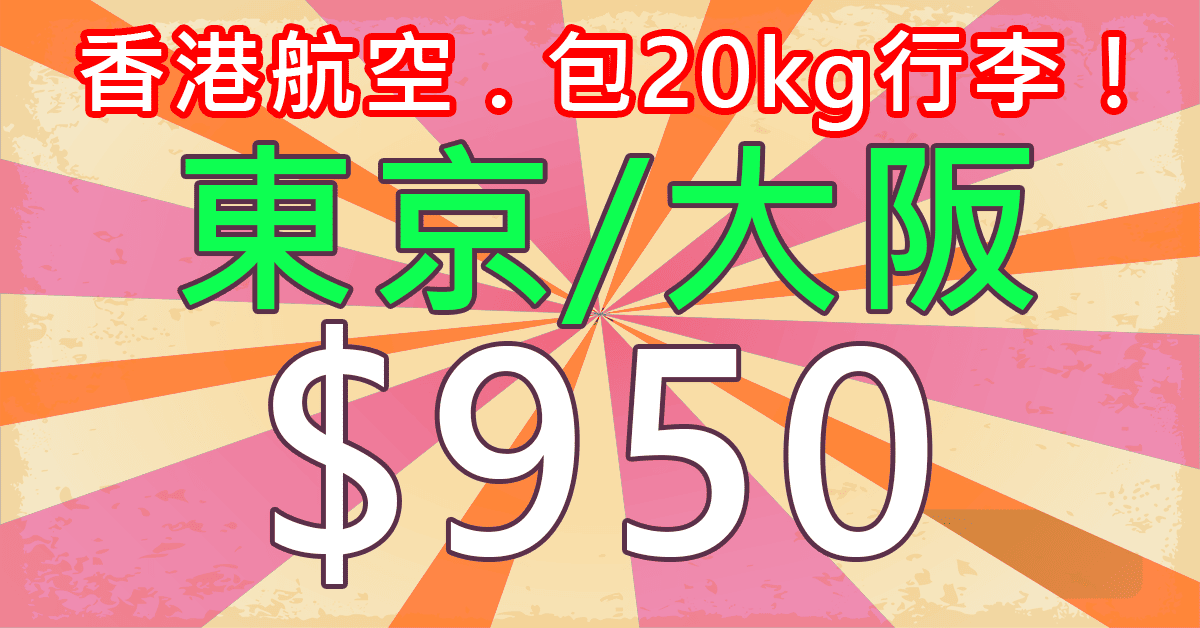抵呀!$950飛日本!包20kg行李!香港往返東京、大阪只需$950 – 香港航空 (優惠至9月20日)