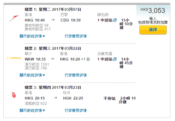 以3月7日香港飛巴黎,3月22日華沙飛香港,3月23日香港飛杭州,來回連稅$3,053