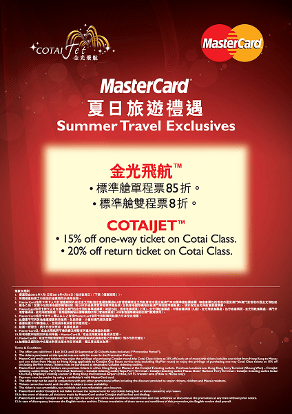 由即日起至9月30日,持MasterCard購買金光飛航既標準艙船票可享有來回船票8折、單程船票85折優惠