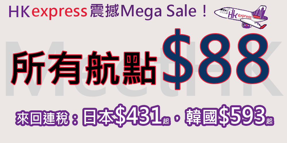 嘩!今晚12點必搶!全線$88 Mega Sale!所有航點單程只需$88 – HK Express (優惠至9月22日)