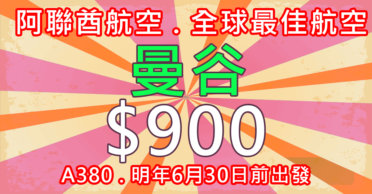泰泰泰抵啦!全球最佳航空兼A380!明年6月30日前出發!香港往返曼谷只需$900 – 阿聯酋航空 Emirates (優惠至10月7日)