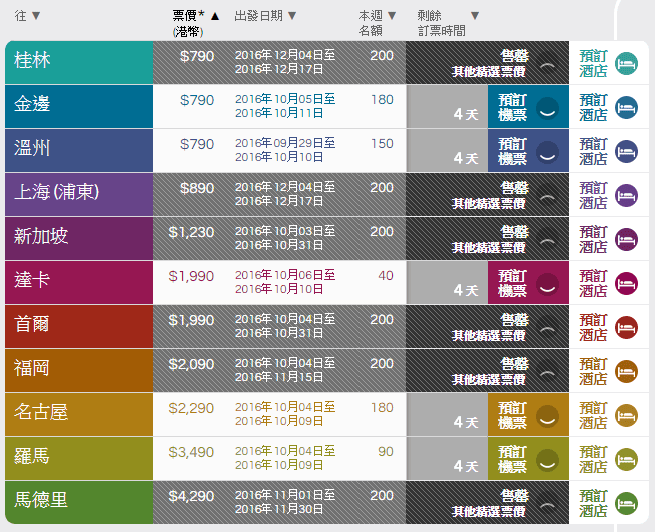 (溫州$790 連稅$1,105)、(金邊$790 連稅$1,194)、(桂林$790 連稅$1,223)、(上海$890 連稅$1,205)、(新加坡$1,230 連稅$1,635)、(首爾$1,990 連稅$2,395)、(達卡$1,990 連稅$2,855)、(福岡$2,090 連稅$2,374)、(名古屋$2,290 連稅$2,696)、(羅馬$3,490 連稅$4,122)、(馬德里$4,290 連稅$5,066)