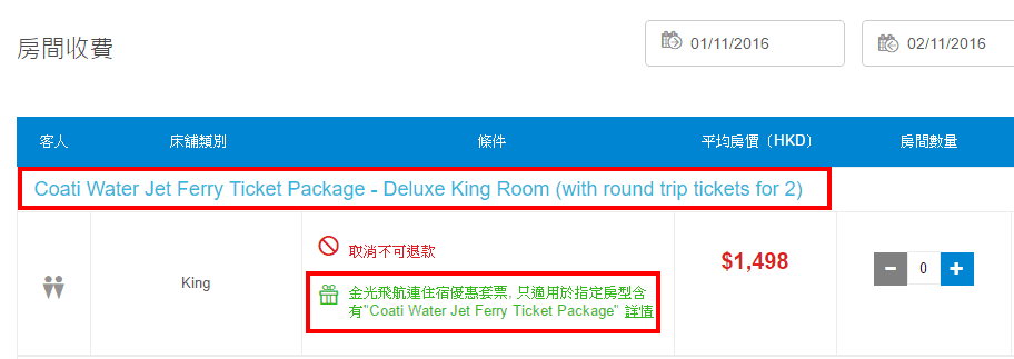 套票已經包左酒店同金光飛航來回船票(包碼頭稅)